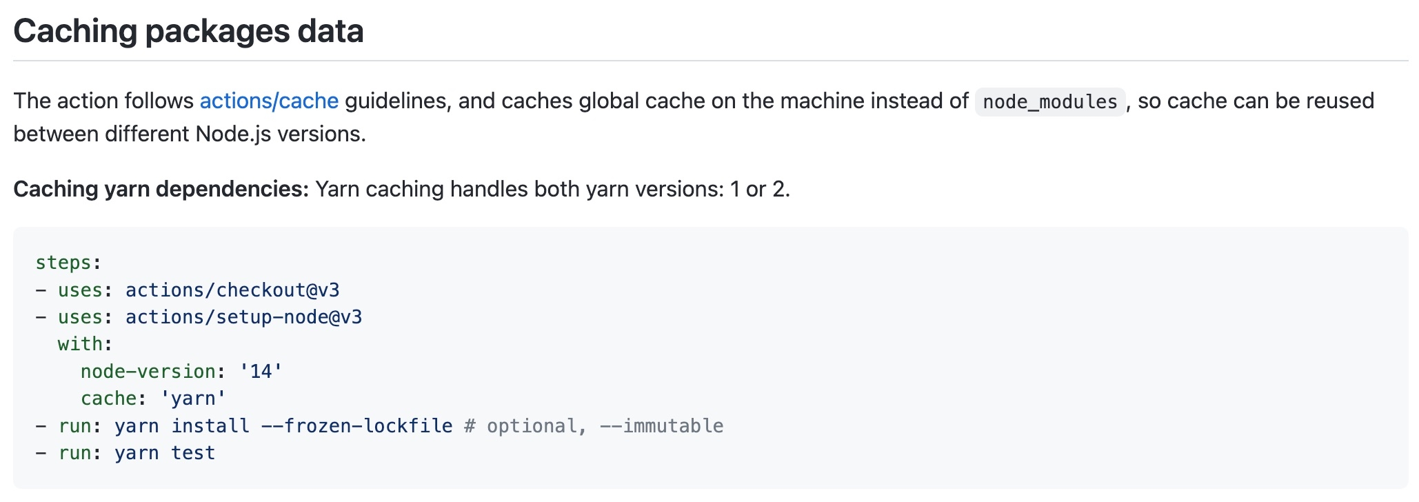- GitHub 에서 제공하는 checkout 액션의 v2 부터 cache 옵션으로 패키지 매니저를 넘길 수 있게 되었고, 이를 이용하여 패키지 설치 시간을 단축할 수 있었습니다.