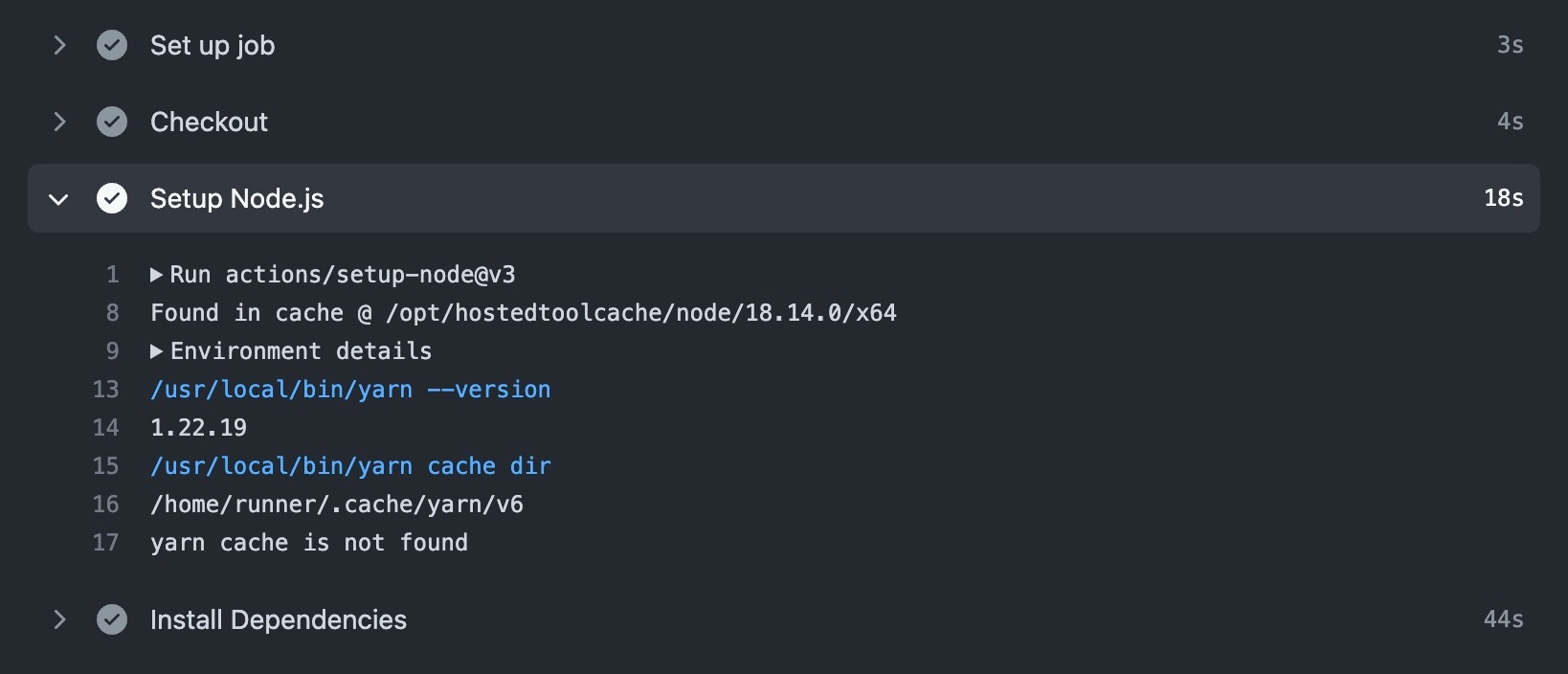위 사진에서 yarn cache is not found 문구를 확인하실 수 있습니다. cache 옵션이 추가된 워크플로우를 처음 실행했을 땐 아직 캐싱된 데이터가 없기 때문입니다.