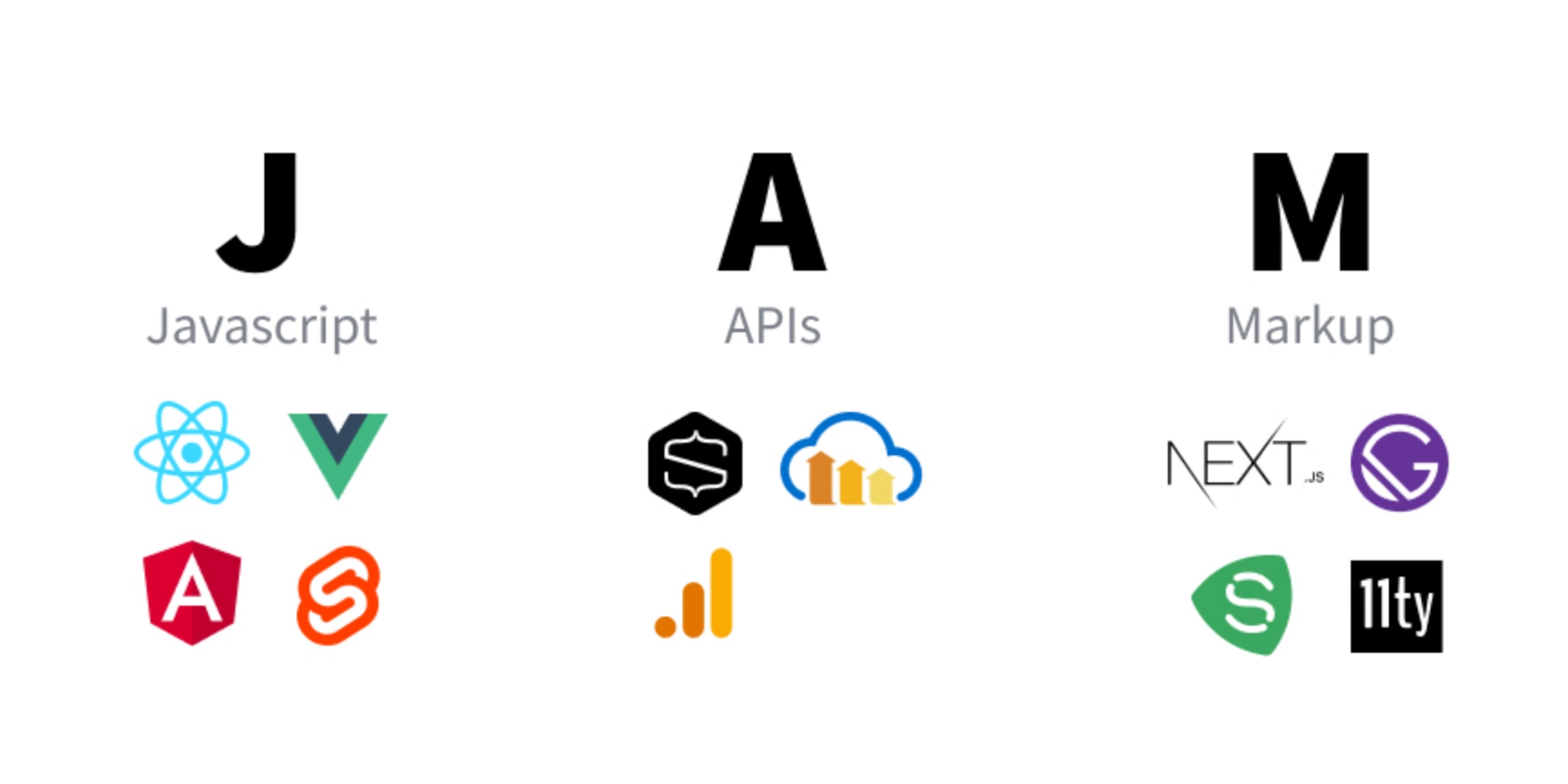 JAM Stack(JavaScript, API, Markup Stack)은 JavaScript, API, HTML 이나 CSS 등을 칭하는 Markup 으로 이루어진 웹 구성 방법입니다.