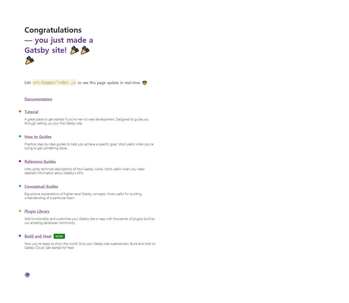 Installing Gatsby... 가 끝나면 위에서 설정한 프로젝트 이름으로 폴더가 생성됩니다. Gatsby 서버를 실행하면 기본 템플릿 화면을 확인할 수 있습니다.