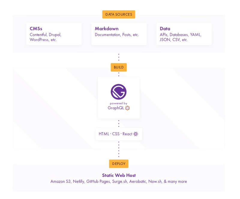 여기서 데이터 소스는 위에 JAM Stack 에서 살펴본 거처럼 Wordpress 같은 CMS 도구가 될 수도 있고 다른 정적 사이트 생성기처럼 Markdown 파일이 될 수도 있고 API 등을 통해서 다른 곳에서 가져올 수도 있습니다.