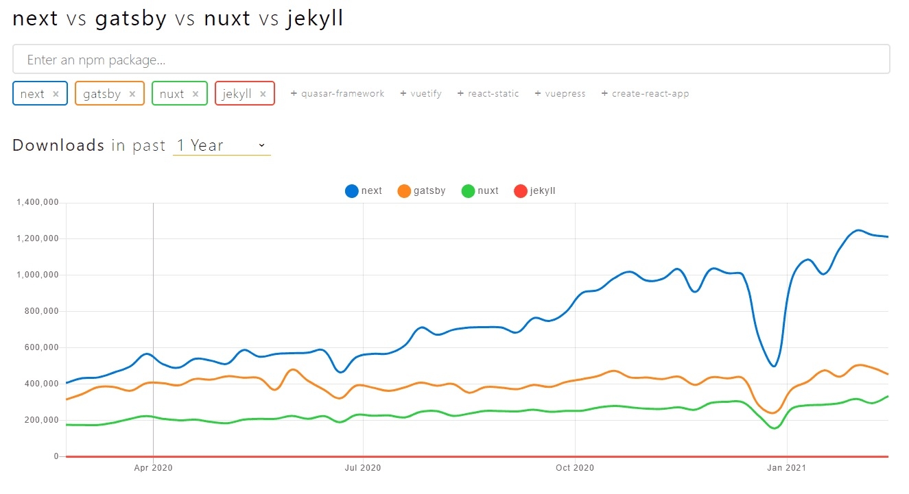 위 사진은 최근 1년간 대표적인 JAM Stack 기반 프레임워크 4가지의 다운로드 횟수를 나타낸 것입니다. Next.js 다운로드 수가 제일 많고, 다음으로 Gatsby 다운로드 수가 많은 것을 볼 수 있습니다.