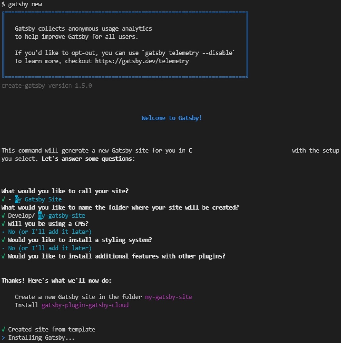 site-name 만 설정하고 starter-url 은 아무것도 작성하지 않으면 자동으로 gatsby-starter-default 가 설정됩니다.
