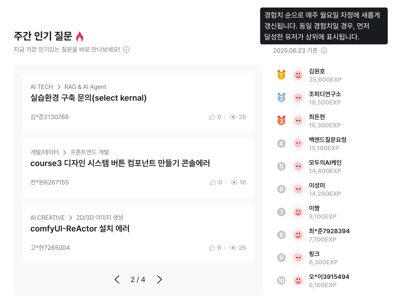 주간 인기 질문 및 주간 활동 TOP 10 영역